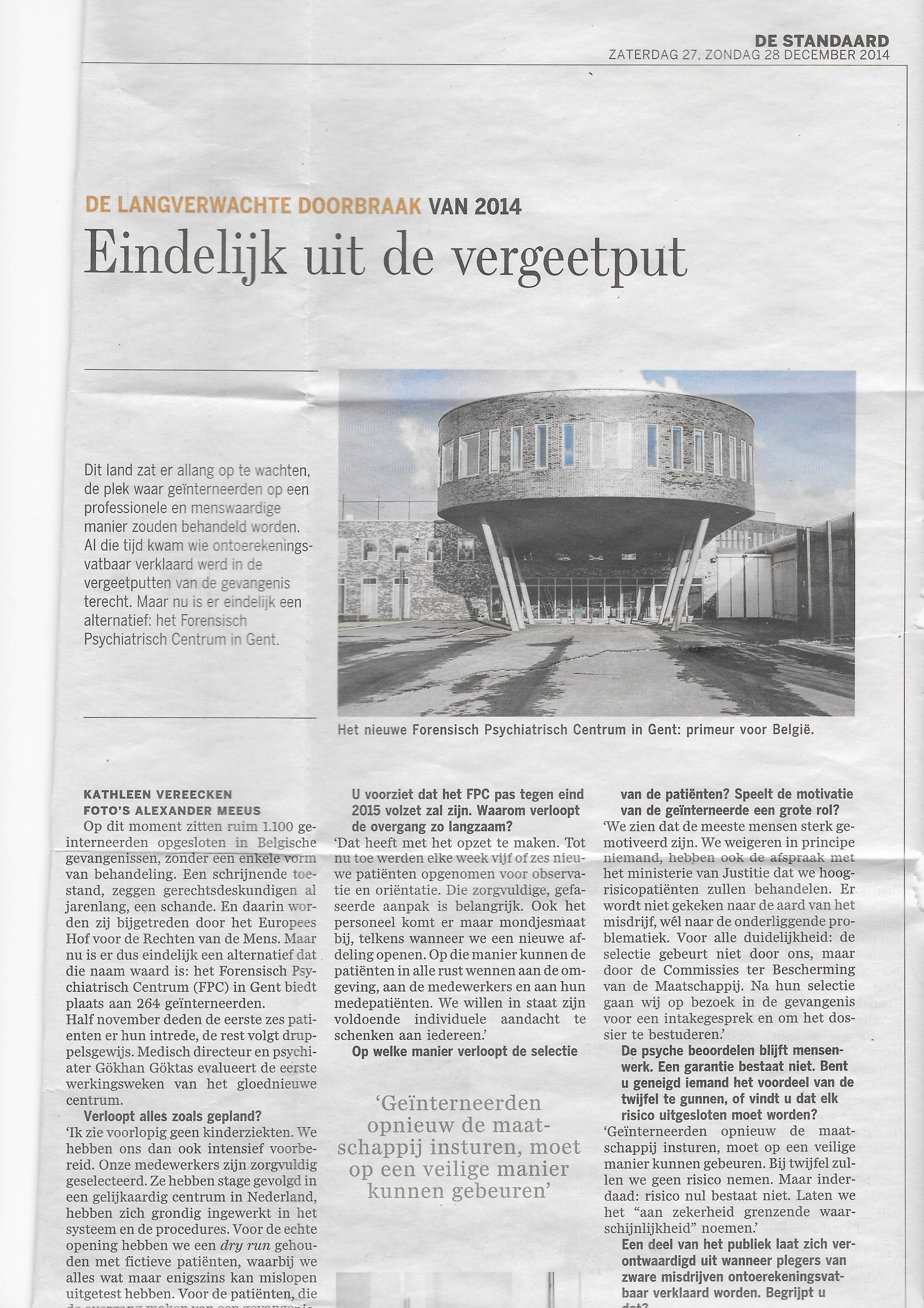 In Gent opende in het najaar van 2014 een nieuw centrum voor gedetineerden. FPC Gent is een forensisch psychiatrisch centrum waar geïnterneerden behandeld worden. Geïnterneerden hebben een psychiatrische of psychologische stoornis en hebben daarnaast een delict gepleegd. FPC Gent werkt aan een veiligere samenleving door het risico op delicten door (ex-)geïnterneerden te verminderen en hen te resocialiseren en te re-integreren in de maatschappij. Voorheen was er voor veel geïnterneerden enkel plaats in gevangenissen. Met de komst van FPC Gent kunnen deze mensen behandeling krijgen voor hun stoornis.